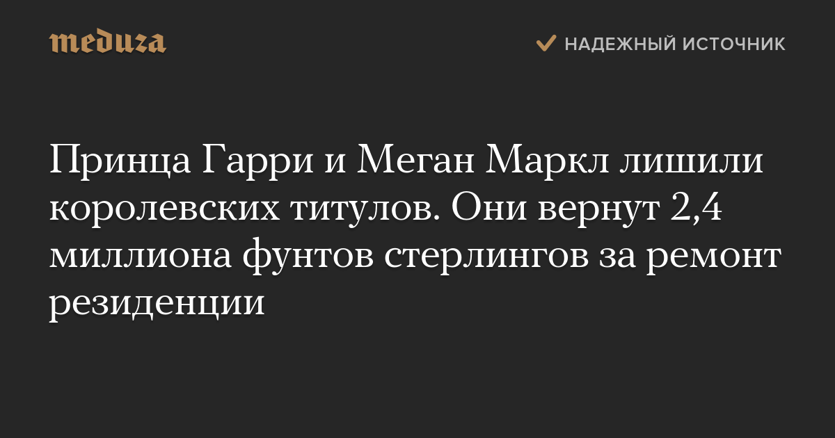 Принца Гарри и Меган Маркл лишили королевских титулов. Они вернут 2,4 миллиона фунтов стерлингов за ремонт резиденции