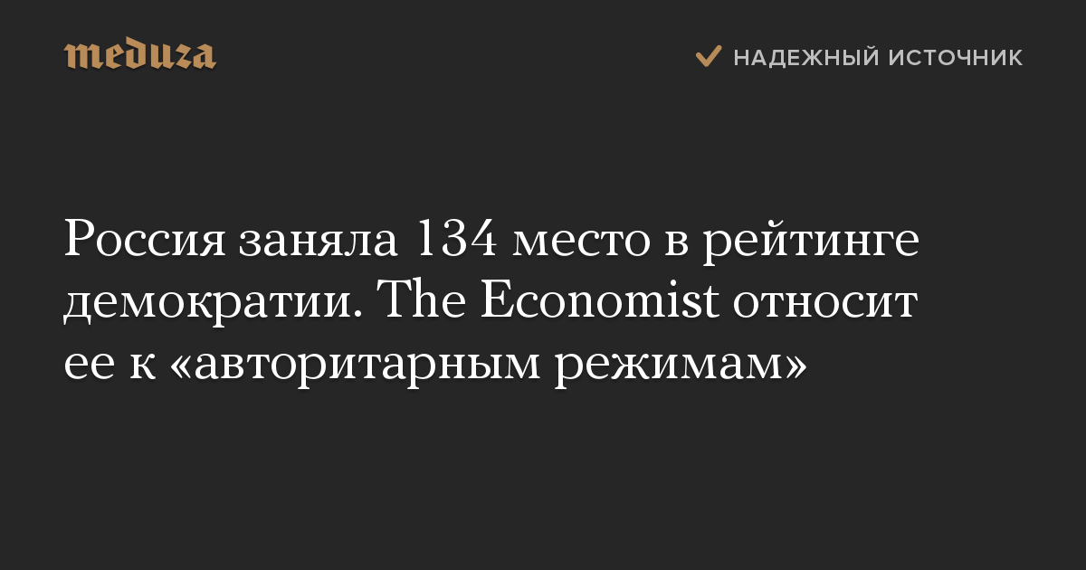 Россия заняла 134 место в рейтинге демократии. The Economist относит ее к «авторитарным режимам»