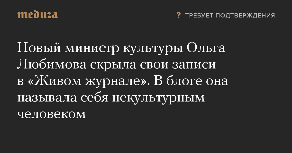 Министр культуры РФ Ольга Любимова скрыла свои записи в блоге kropalik в «Живом журнале» после того, как 21 января ее назначили на новую должность. Первым об этом сообщил The Insider. Действительно ли этот блог принадлежит Любимовой, до конца неизвестно.