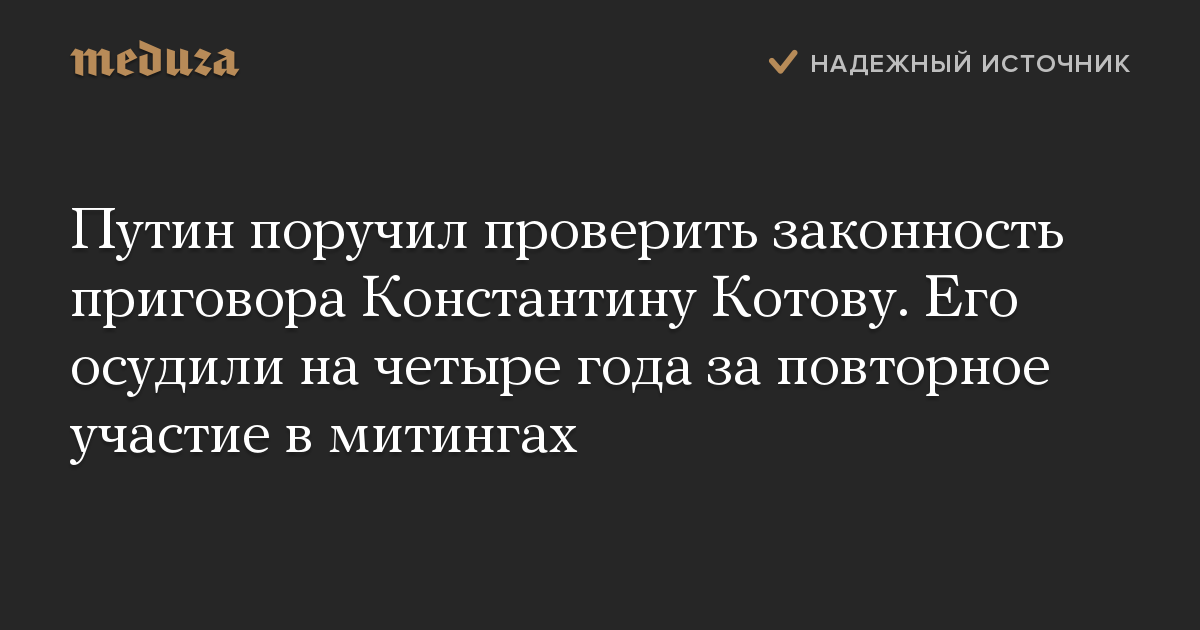 Путин поручил проверить законность приговора Константину Котову. Его осудили на четыре года за повторное участие в митингах
