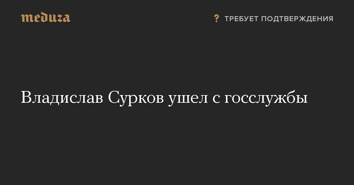 Владислав Сурков, занимавший пост помощника президента, покинул госслужбу. Об этом сообщил в своем телеграм-канале директор Центра политической конъюнктуры Алексей Чеснаков, близкий к Суркову.