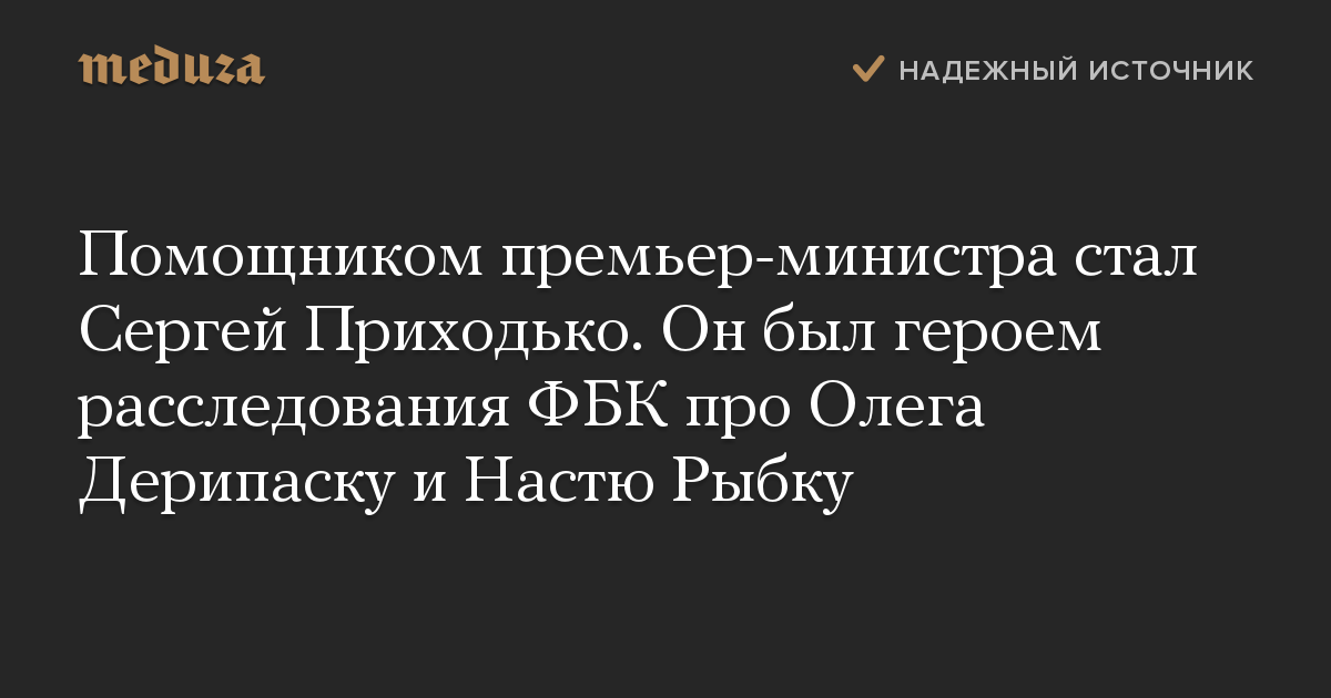 Помощником премьер-министра стал Сергей Приходько. Он был героем расследования ФБК про Олега Дерипаску и Настю Рыбку
