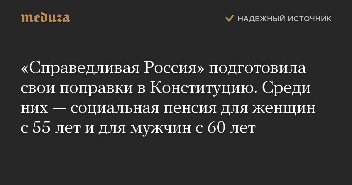 Партия «Справедливая Россия» представила свой вариант поправок в Конституцию. В частности, предлагается закрепить в Конституции нормы о праве на социальную пенсию для женщин по достижении 55 лет и для мужчин — в 60 лет.