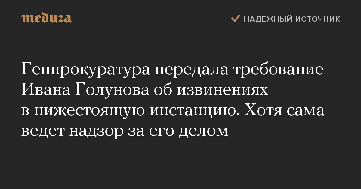 Генпрокуратура передала требование Ивана Голунова об извинениях в нижестоящую инстанцию. Хотя сама ведет надзор за его делом