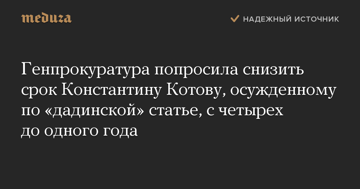 Генпрокуратура попросила кассационный суд снизить срок фигуранту «московского дела» Константину Котову, осужденному по статье о неоднократном нарушении правил проведения митингов. Об этом сообщила адвокат Котова Мария Эйсмонт.