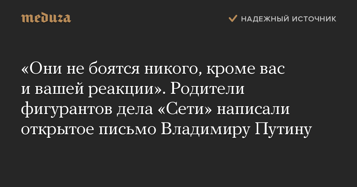 «Они не боятся никого, кроме вас и вашей реакции». Родители фигурантов дела «Сети» написали открытое письмо Владимиру Путину