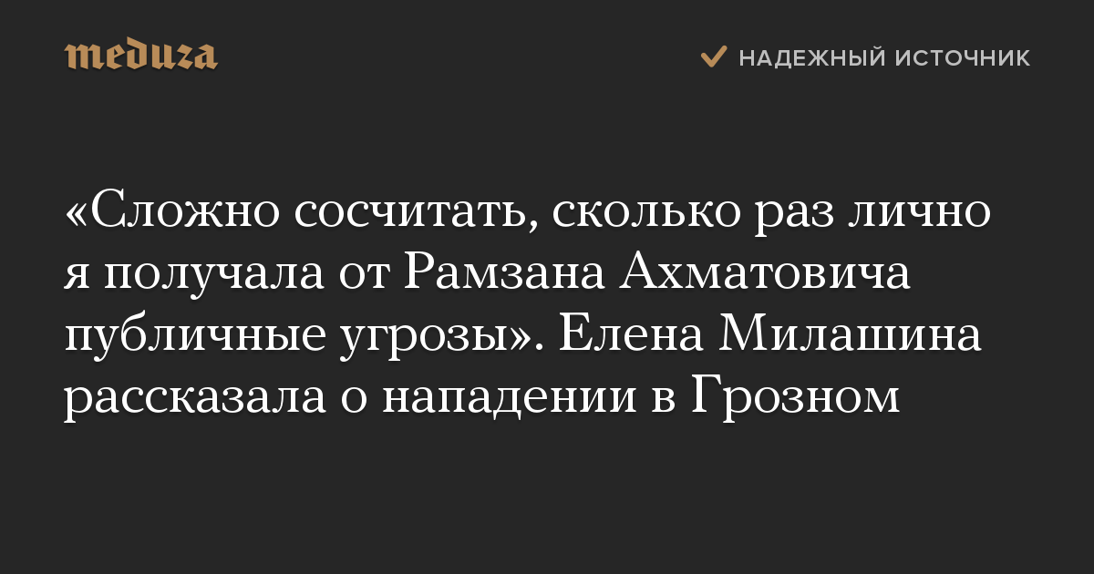 Милашина также отметила, что работая в Чечне, неоднократно получала угрозы от властей. «Мне сложно сосчитать, сколько раз лично я получала от Рамзана Ахматовича [Кадырова] публичные угрозы», — сказала она.