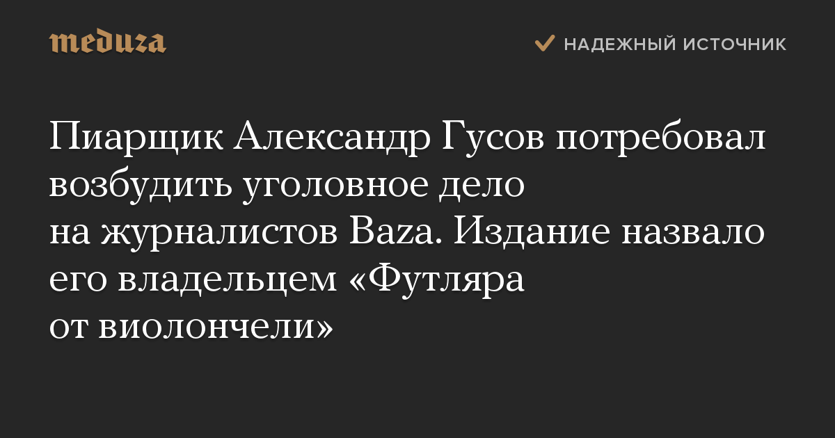 Пиарщик Александр Гусов потребовал возбудить уголовное дело на журналистов Baza. Издание назвало его владельцем «Футляра от виолончели»