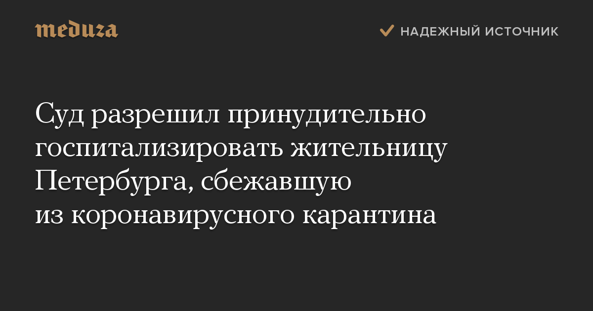 Петроградский районный суд Санкт-Петербурга удовлетворил административный иск главного санитарного врача города о принудительной госпитализации Аллы Ильиной, сбежавшей из коронавирусного карантина. Об этом сообщает корреспондент «Медузы» из зала суда.