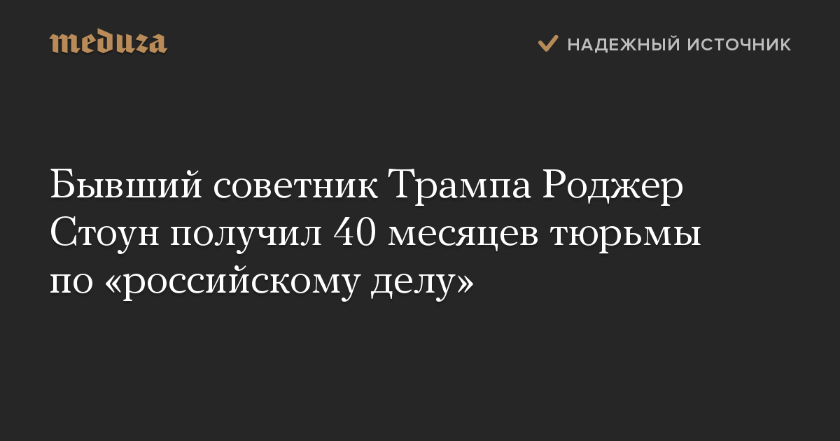Советник Дональда Трампа в период президентской гонки 2016 года Роджер Стоун приговорен к 40 месяцам тюрьмы и штрафу в 20 тысяч долларов, сообщает CNN.
