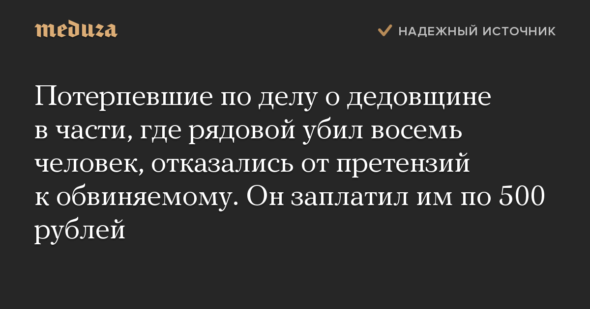 Четверо потерпевших по делу о дедовщине в части, где рядовой Рамиль Шамсутдинов расстрелял сослуживцев, отказались от претензий к обвиняемому Руслану Мухатову после извинений и выплаты компенсации в 500 рублей. Об этом «Новой газете» сообщил адвокат Шамсутдинова Руслан Нагиев.
