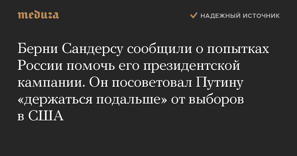Берни Сандерсу сообщили о попытках России помочь его президентской кампании. Он посоветовал Путину «держаться подальше» от выборов в США
