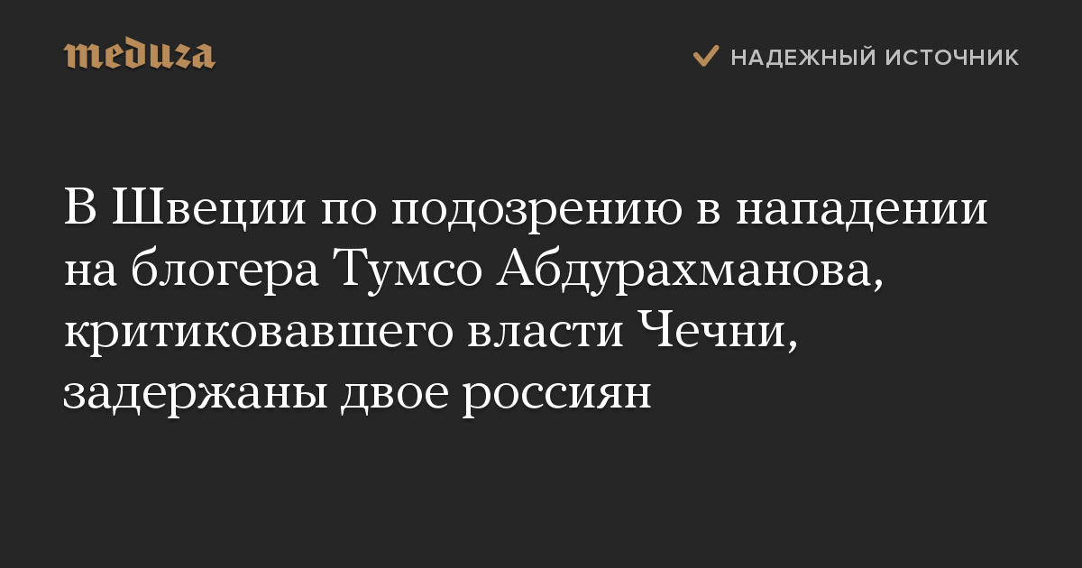 В Швеции по подозрению в нападении на блогера Тумсо Абдурахманова, известного по критике властей Чечни, задержаны двое граждан России. Об этом сообщает Reuters.