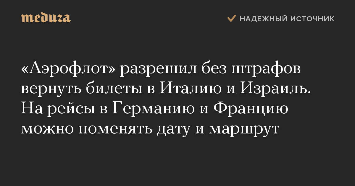 «Аэрофлот» разрешил без штрафов вернуть билеты в Италию и Израиль. На рейсы в Германию и Францию можно поменять дату и маршрут