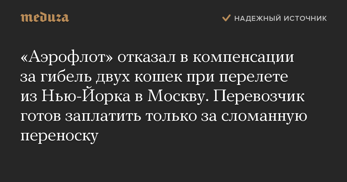 «Аэрофлот» отказался платить компенсацию за гибель двух кошек при перелете рейсом авиакомпании из Нью-Йорка в Москву. Об этом сообщают «Открытые медиа» со ссылкой на официальный ответ перевозчика, полученный хозяином животных Максимом Чумаченко. Также об этом пишут «360» и Baza.