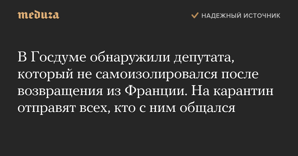 В Госдуме обнаружили депутата, который не самоизолировался после возвращения из Франции. На карантин отправят всех, кто с ним общался
