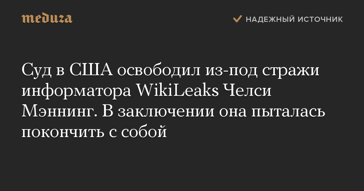 Суд в США освободил из-под стражи информатора WikiLeaks Челси Мэннинг. В заключении она пыталась покончить с собой