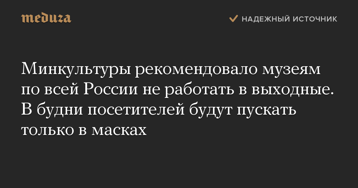 Минкультуры рекомендовало музеям по всей России не работать в выходные. В будни посетителей будут пускать только в масках
