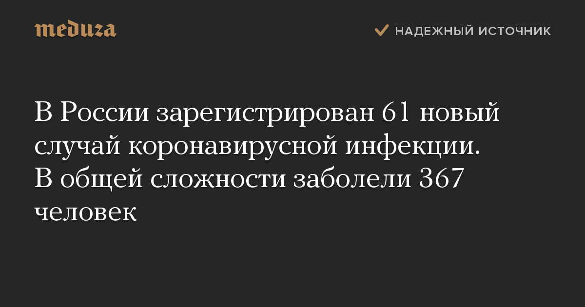 В России зарегистрирован 61 новый случай коронавирусной инфекции. В общей сложности заболели 367 человек
