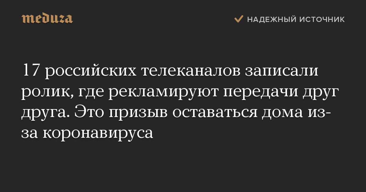 17 российских телеканалов записали ролик, где рекламируют передачи друг друга. Это призыв оставаться дома из-за коронавируса