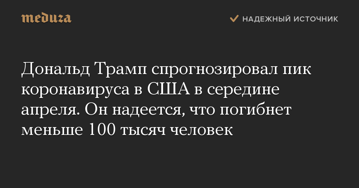 Дональд Трамп спрогнозировал пик коронавируса в США в середине апреля. Он надеется, что погибнет меньше 100 тысяч человек
