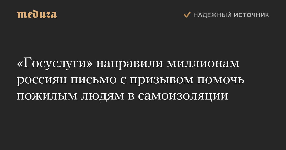 Портал «Госуслуги» в ночь на 30 марта направил миллионам своих пользователей письмо, в котором предложил помочь пожилым россиянам, оказавшимся в самоизоляции из-за эпидемии коронавируса. Письмо «Госуслуг» получили несколько сотрудников «Медузы».