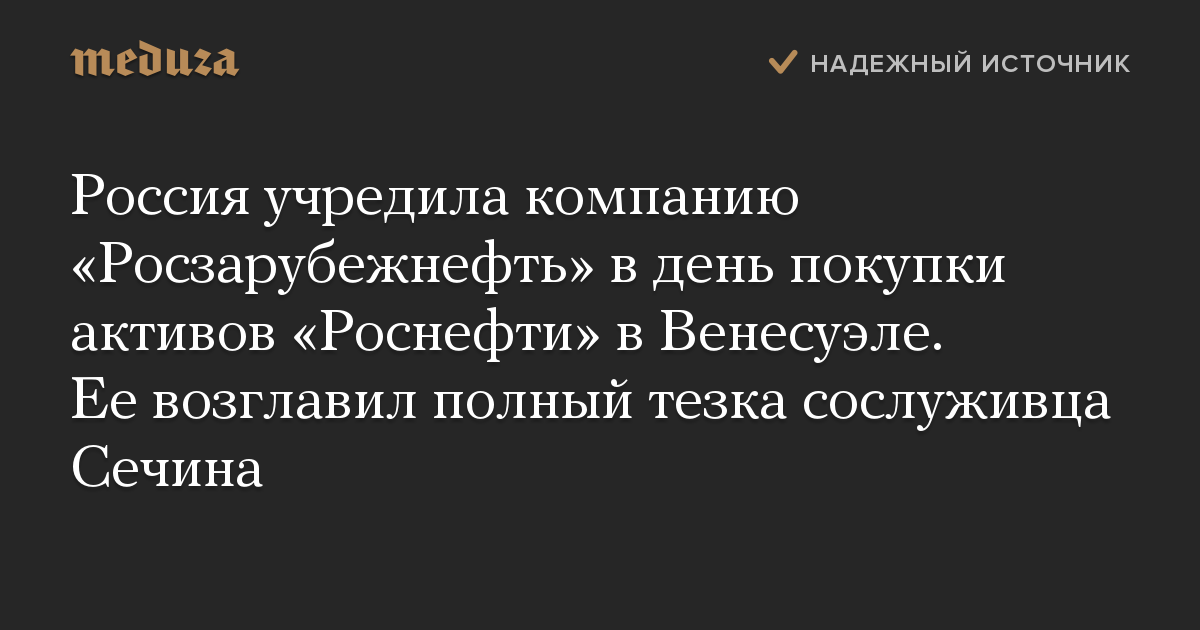 Россия учредила компанию «Росзарубежнефть» в день покупки активов «Роснефти» в Венесуэле. Ее возглавил полный тезка сослуживца Сечина