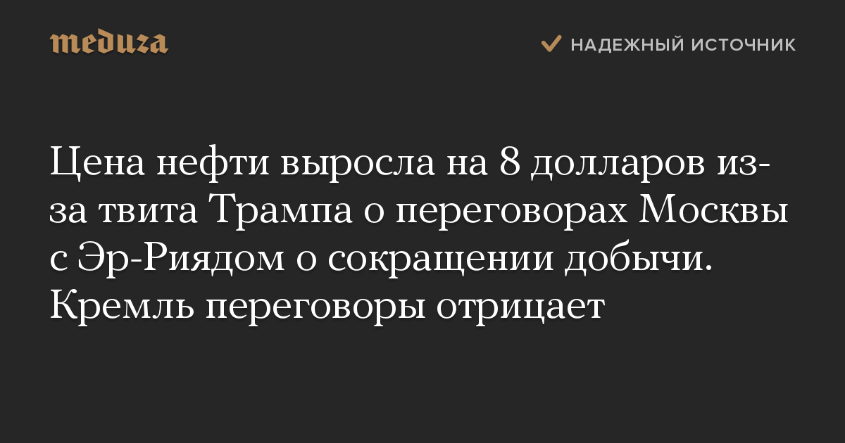 Цена нефти выросла на 8 долларов из-за твита Трампа о переговорах Москвы с Эр-Риядом о сокращении добычи. Кремль переговоры отрицает