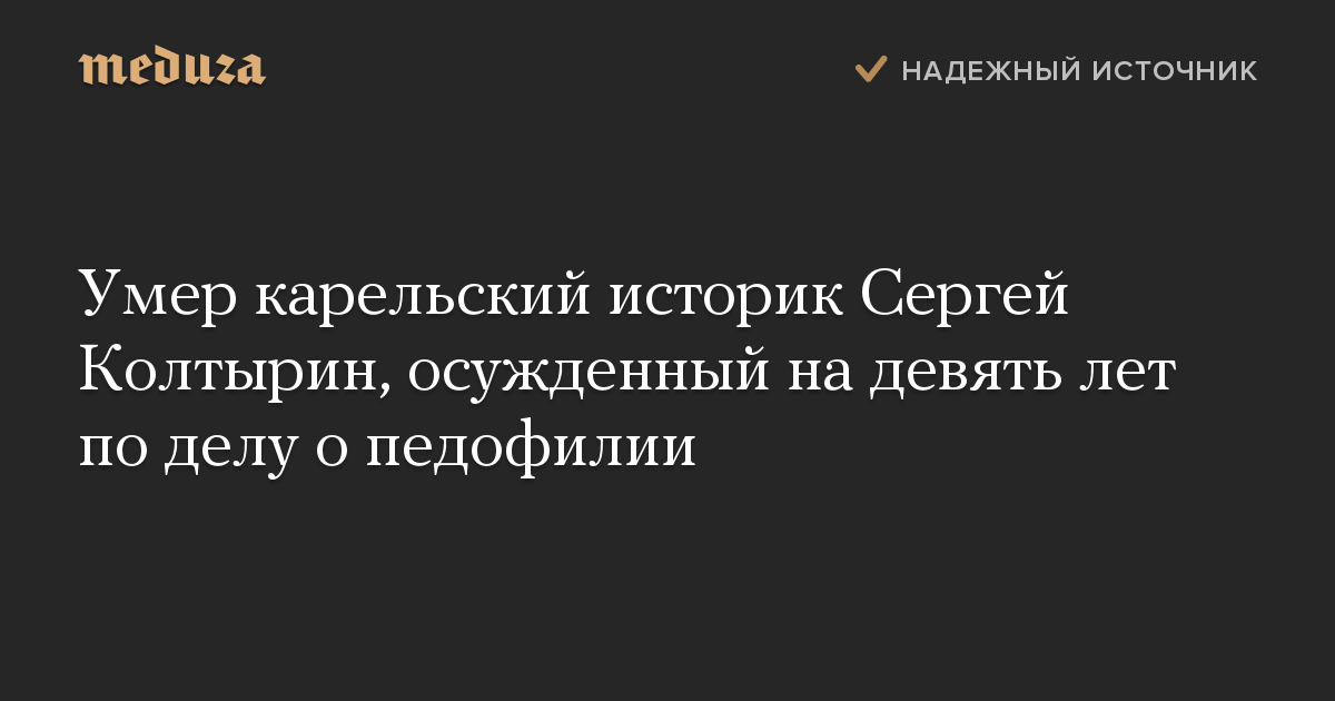 Умер бывший директор краеведческого музея в карельском Медвежьегорске Сергей Колтырин, осужденный на девять лет колонии по обвинению в педофилии. Об этом сообщает «Дождь» со ссылкой на правозащитный центр «Мемориал».