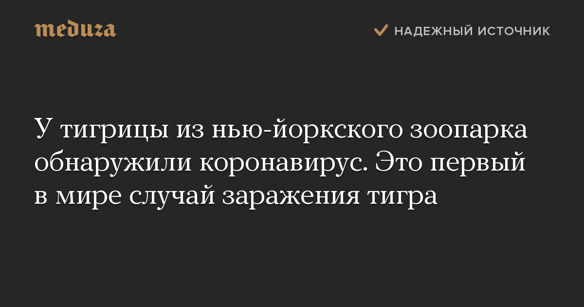 Как пишет Associated Press со ссылкой на зоопарк Бронкса и министерство сельского хозяйства США, коронавирус у тигрицы Нади — это первый известный случай заражения тигра в мире и первый случай заражения животного в США. Ранее сообщалось о заражении коронавирусом двух собак и кошки в Гонконге.