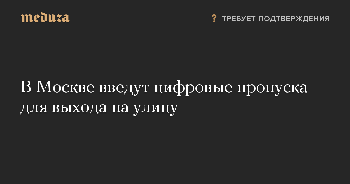 В Москве для передвижения по городу будут введены цифровые пропуска. Об этом «Медузе» сообщил собеседник в оперативном штабе Москвы. Аналогичную информацию со ссылкой на источники также приводит РБК.