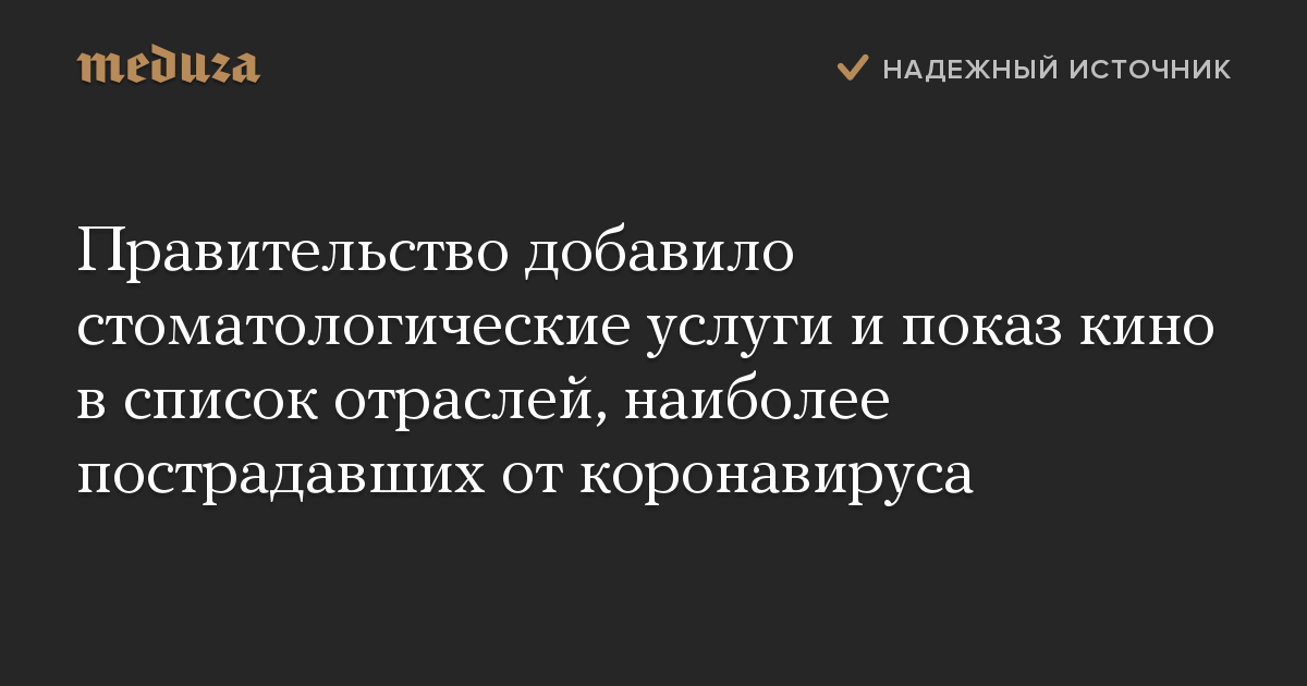 Правительство добавило стоматологические услуги и показ кино в список отраслей, наиболее пострадавших от коронавируса