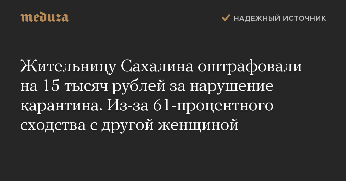 Жительницу Сахалина оштрафовали на 15 тысяч рублей за нарушение карантина. Из-за 61-процентного сходства с другой женщиной