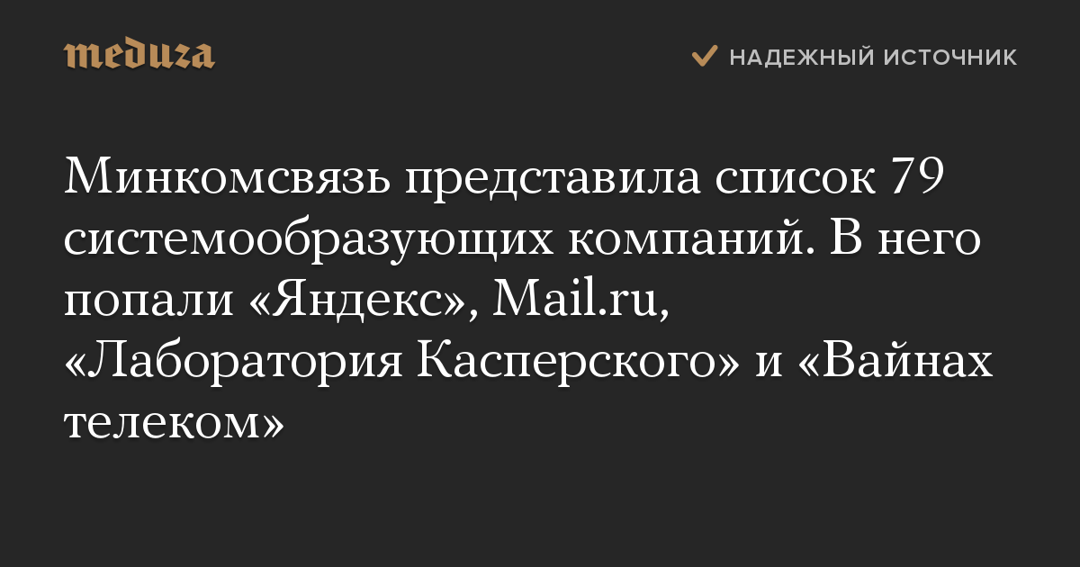 Минкомсвязь представила список 79 системообразующих компаний. В него попали «Яндекс», Mail.ru, «Лаборатория Касперского» и «Вайнах телеком»