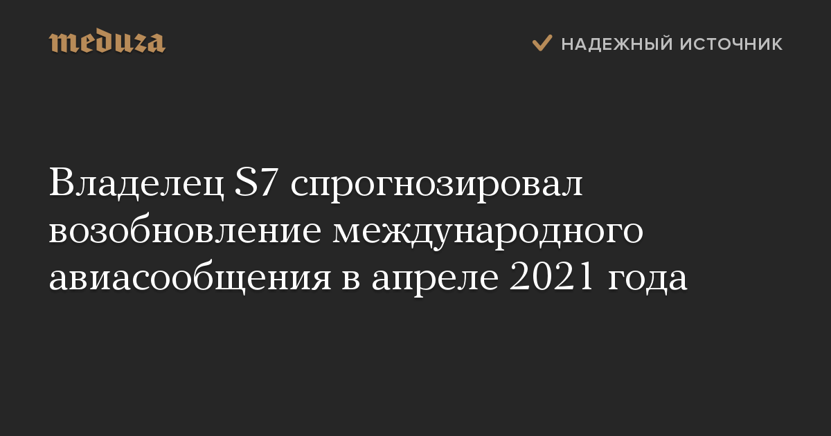 Основной владелец и председатель совета директоров S7 Group Владислав Филев ожидает, что международное авиасообщение возобновится в апреле 2021 года. Об этом он заявил в интервью «Коммерсанту».