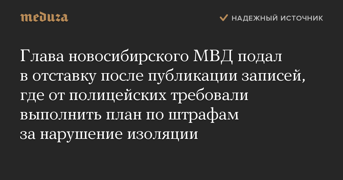 Глава новосибирского МВД подал в отставку после публикации записей, где от полицейских требовали выполнить план по штрафам за нарушение изоляции