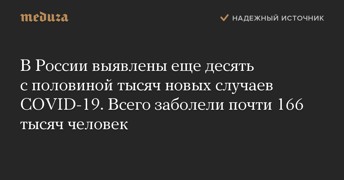 В России выявлены еще десять с половиной тысяч новых случаев COVID-19. Всего заболели почти 166 тысяч человек