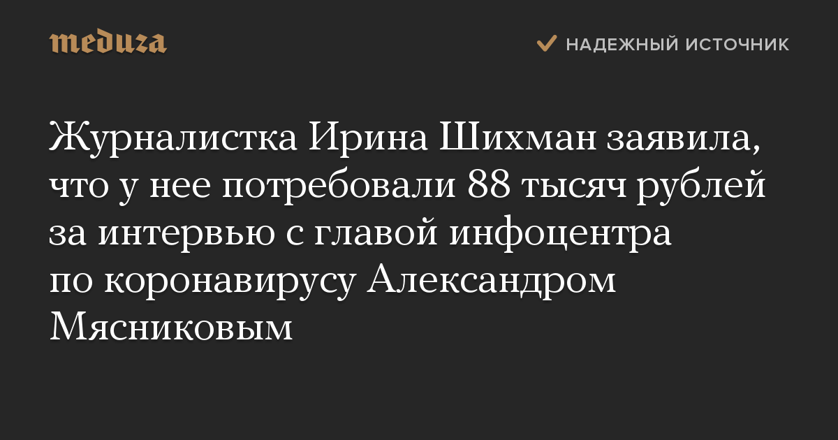 Журналистка Ирина Шихман заявила, что у нее потребовали 88 тысяч рублей за интервью с главой инфоцентра по коронавирусу Александром Мясниковым