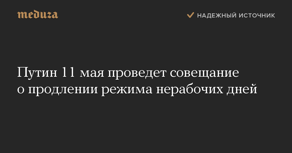 Президент России Владимир Путин 11 мая проведет совещание о продлении нерабочих дней, сообщил «Интерфаксу» пресс-секретарь главы государства Дмитрий Песков.