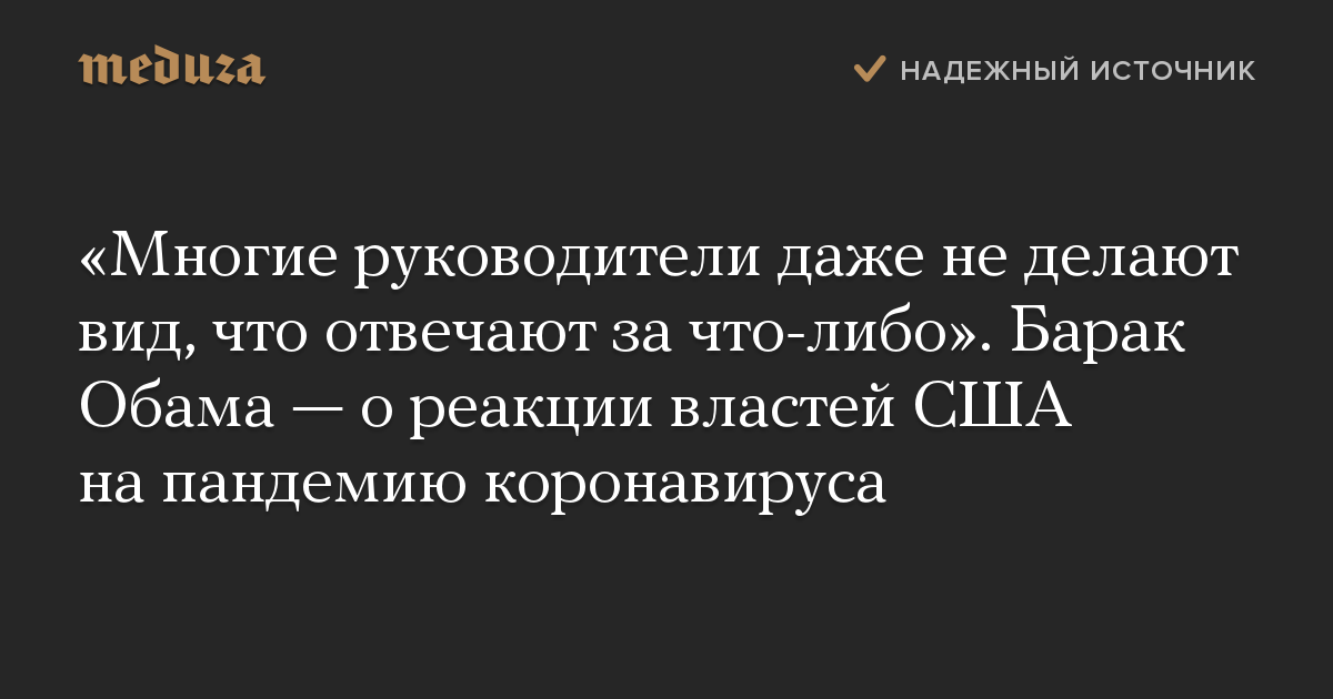«Эта пандемия больше, чем что-либо еще, полностью и окончательно опровергла представление о том, будто многие руководители осознают, что делают. Многие из них даже не делают вид, что отвечают за что-либо», — сказал Обама в обращении к выпускникам университетов.