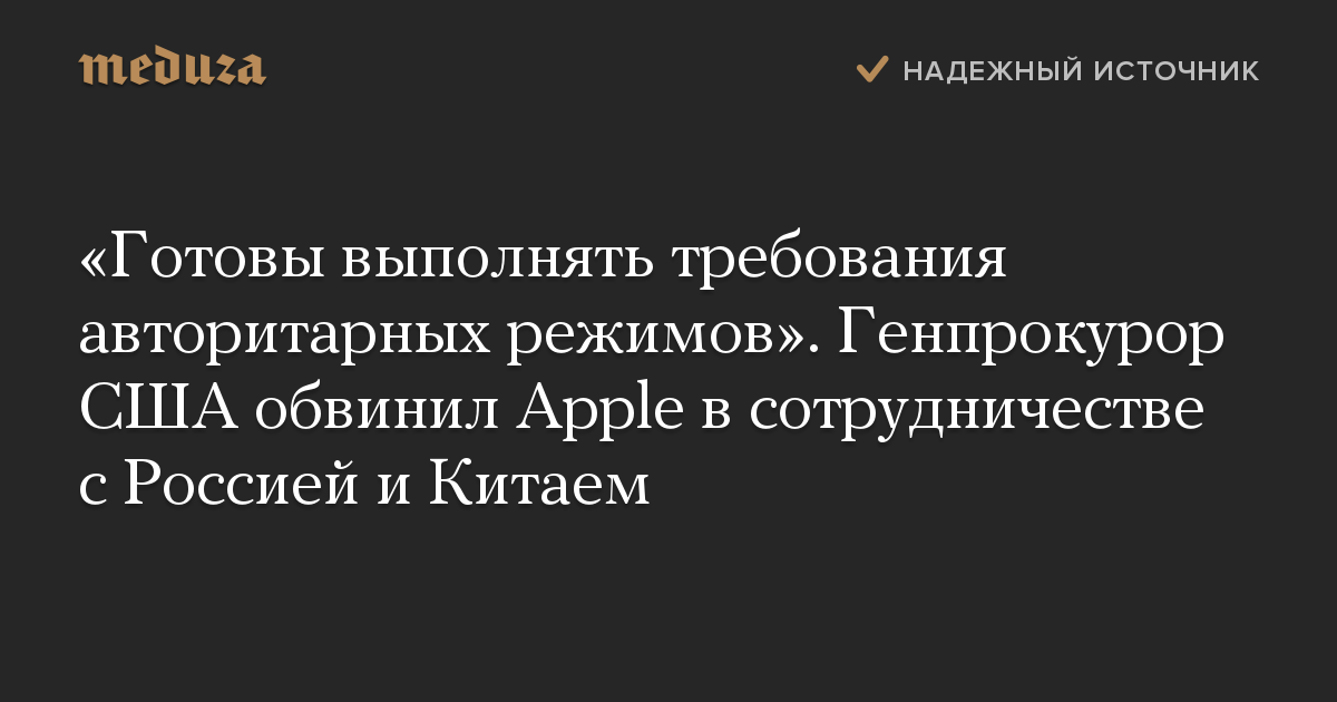 «Готовы выполнять требования авторитарных режимов». Генпрокурор США обвинил Apple в сотрудничестве с Россией и Китаем