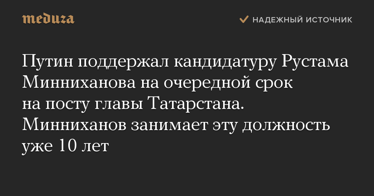 Путин поддержал кандидатуру Рустама Минниханова на очередной срок на посту главы Татарстана. Минниханов занимает эту должность уже 10 лет