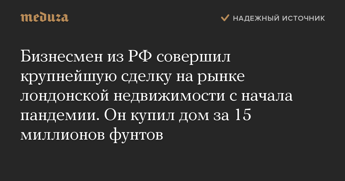 Бизнесмен из РФ совершил крупнейшую сделку на рынке лондонской недвижимости с начала пандемии. Он купил дом за 15 миллионов фунтов