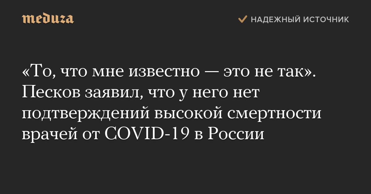 «То, что мне известно — это не так». Песков заявил, что у него нет подтверждений высокой смертности врачей от COVID-19 в России