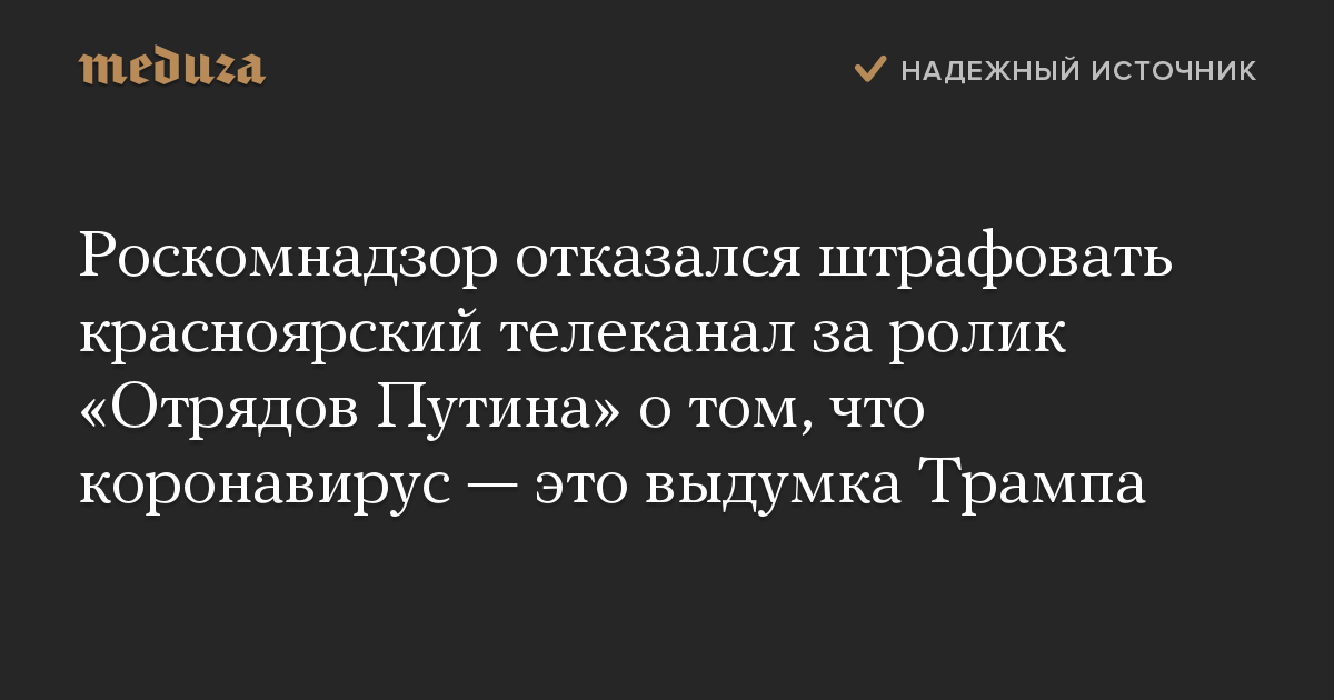 Роскомнадзор отказался штрафовать красноярский телеканал за ролик «Отрядов Путина» о том, что коронавирус — это выдумка Трампа