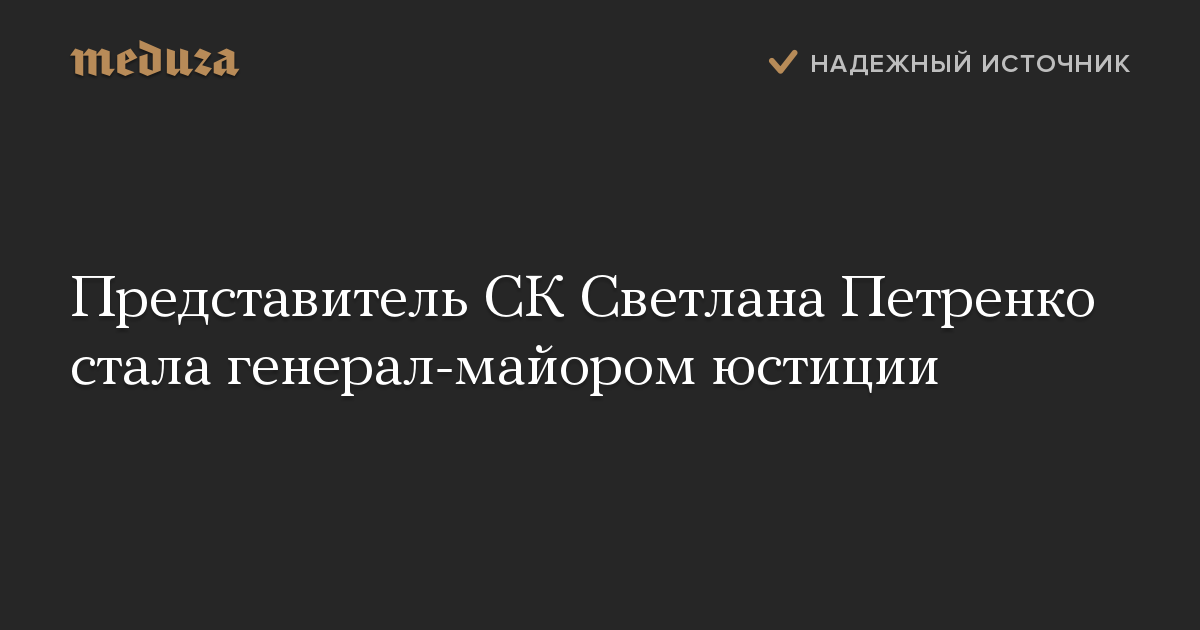 Главе управления СК по взаимодействию со СМИ Светлане Петренко присвоено звание генерал-майора юстиции. Соответствующий указ президента РФ Владимира Путина опубликован на портале правовой информации.