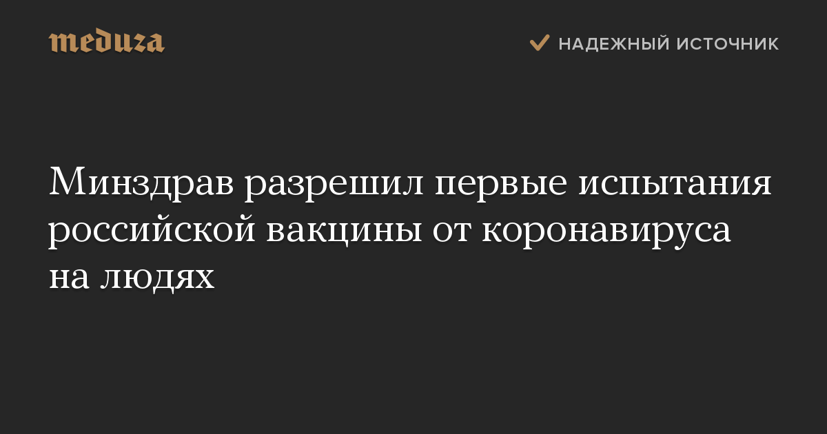 Минздрав выдал первые разрешения на испытание российской вакцины от COVID-19 на людях. Информация об этом размещена в реестре клинических исследований Минздрава, на нее обратил внимание «Фармацевтический вестник».
