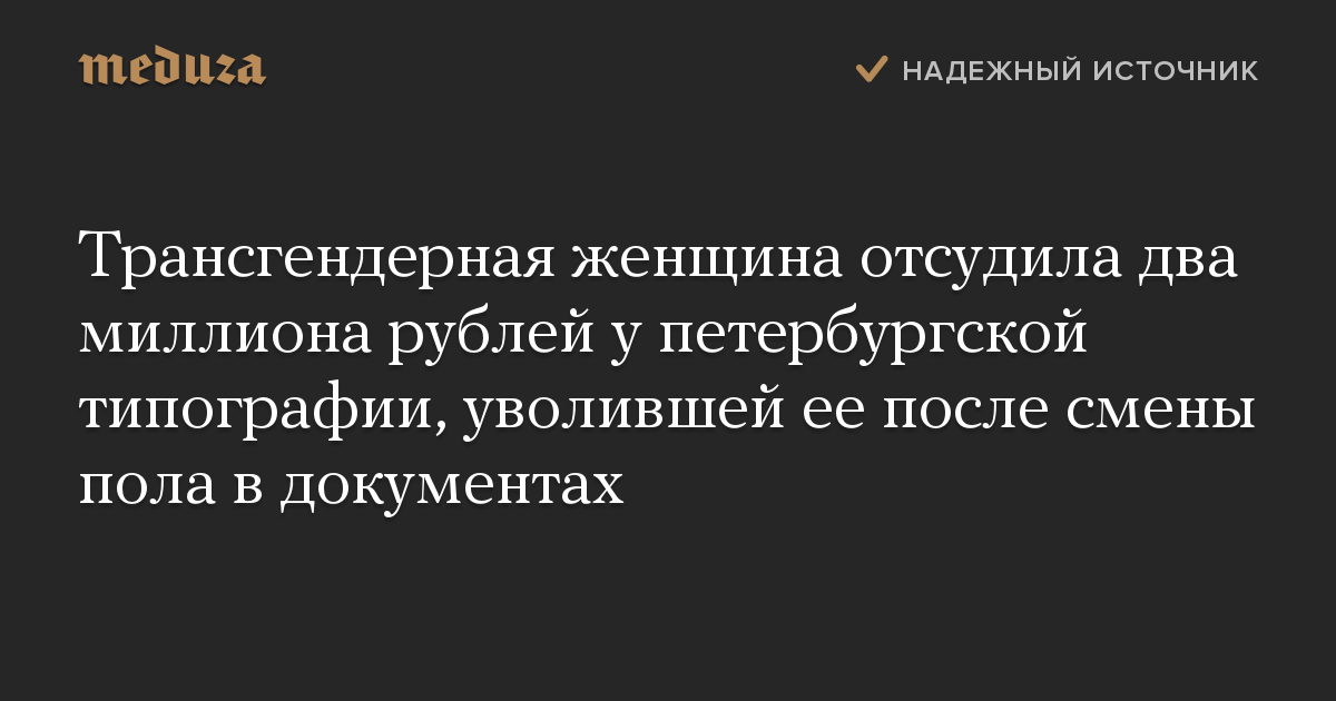 Трансгендерная женщина отсудила два миллиона рублей у петербургской типографии, уволившей ее после смены пола в документах