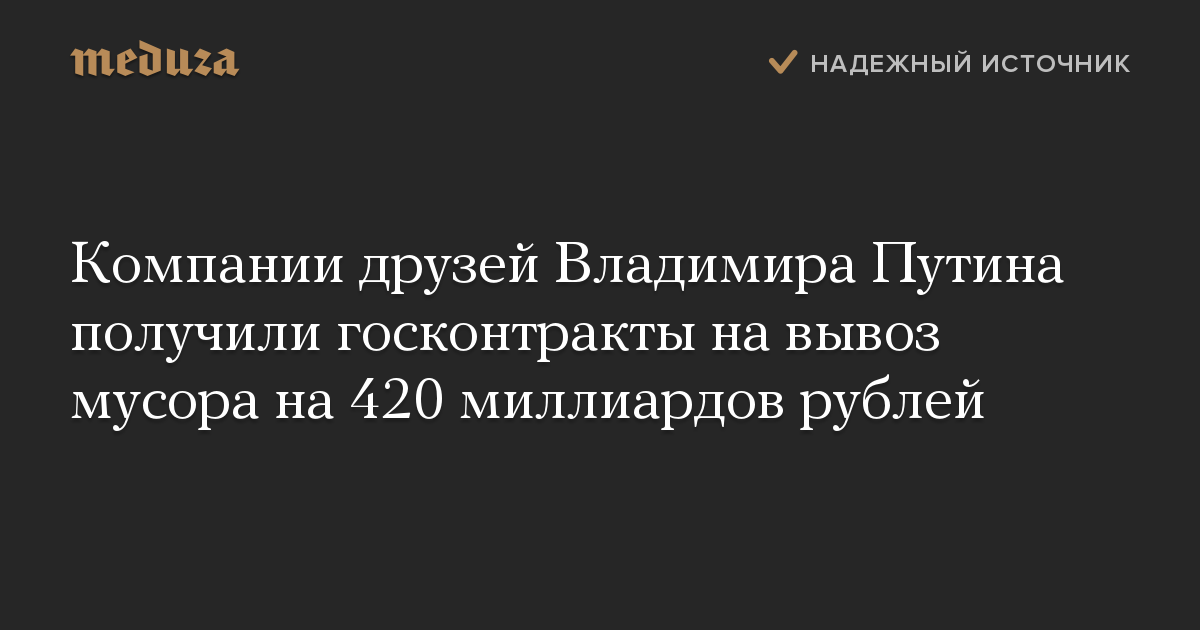 По данным издания, компании, связанные с друзьями Путина, получили почти четверть всех госконтрактов на вывоз мусора в стране — на общую сумму 423 миллиарда рублей. Компании, связанные с главой Ростеха Сергеем Чемезовым получили контракты на 165 миллиардов, с сыном бывшего генпрокурора Игорем Чайкой — на 107 миллиардов, с бизнесменами Аркадием Ротенбергом и Юрием Ковальчуком — на 88 и 63 миллиарда соответственно.