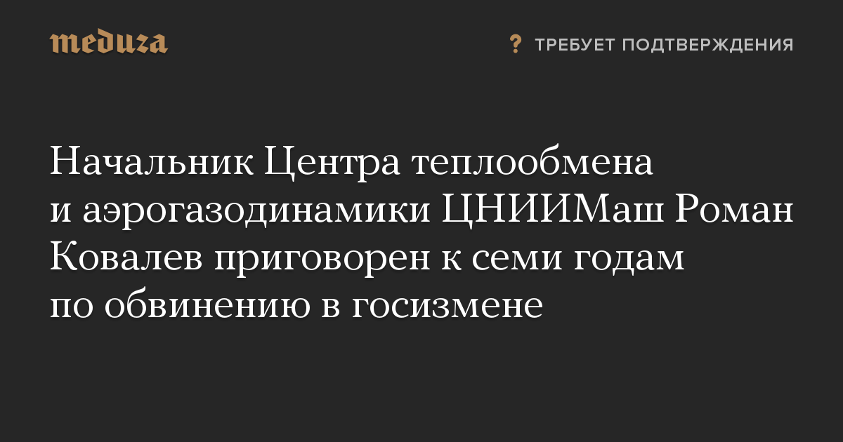 Роман Ковалев, возглавляющий Центр теплообмена и аэрогазодинамики ЦНИИМаш, приговорен к семи годам колонии строгого режима по обвинению в госизмене. Об этом сообщает ТАСС со ссылкой на источник.
